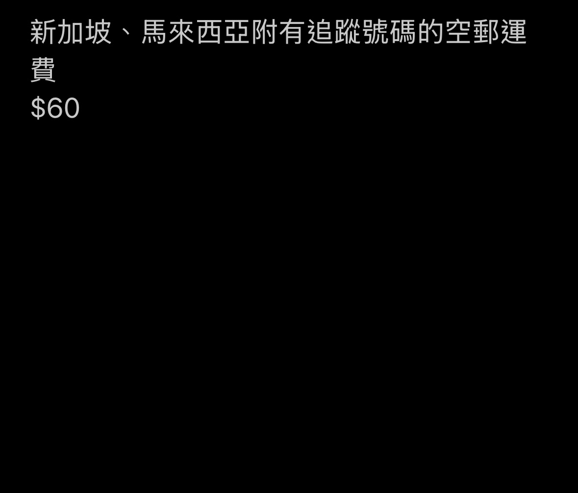 新加坡、馬來西亞附有追蹤號碼的空運郵費 請留意實際收費可能有偏差,如有差額產生,我們不會退還款項,謝謝。